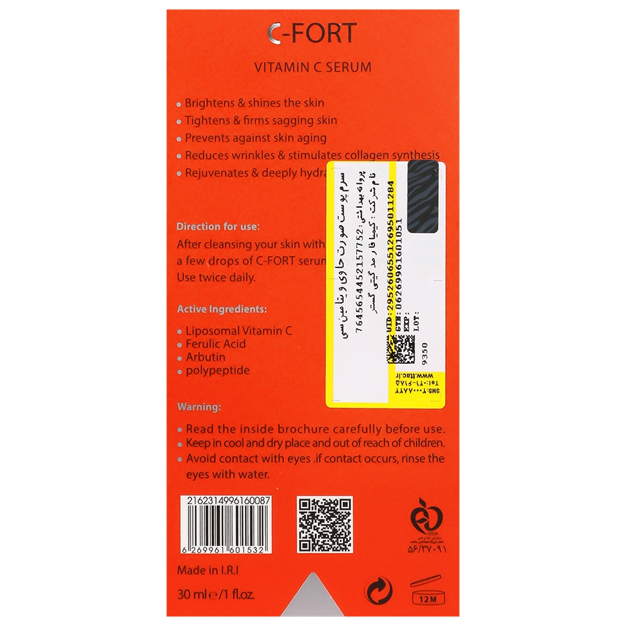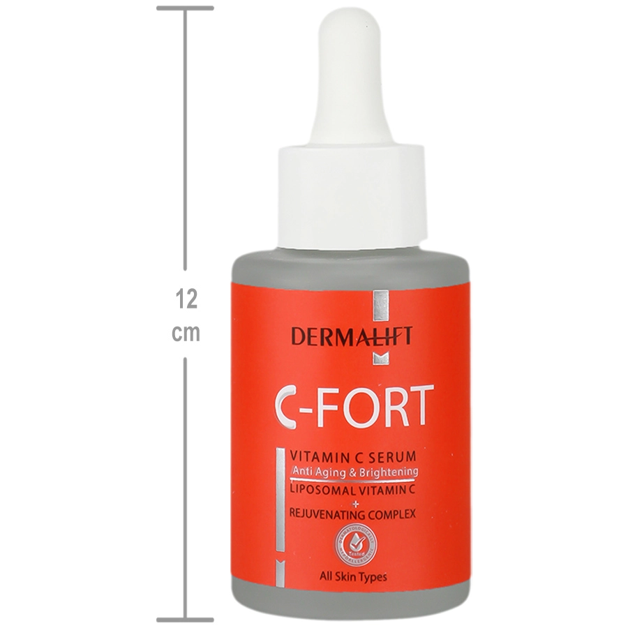 سرم صورت درمالیفت مدل سی فورت (C-Fort) با حجم 30 میلیلیتر، یک فرمولاسیون پیشرفته و پایدار حاوی ویتامین C است که بهطور علمی برای مقابله با رادیکالهای آزاد، روشنسازی پوست و نشانههای پیری طراحی شده است. این سرم با بهرهگیری از فرم پایدار و مؤثر ویتامین C، نتایج قابلمشاهدهای در بهبود تُن و بافت پوست، کاهش لکها و افزایش درخشندگی طبیعی ارائه میدهد و برای اکثر انواع پوست (به استثنای پوستهای بسیار حساس فعال) مناسب است.