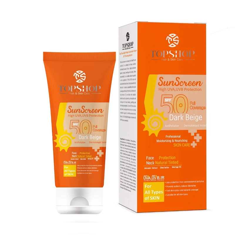 کرم ضد آفتاب رنگی بژ تیره تاپ شاپ SPF50 مناسب انواع پوست حجم 50 میلی لیتر