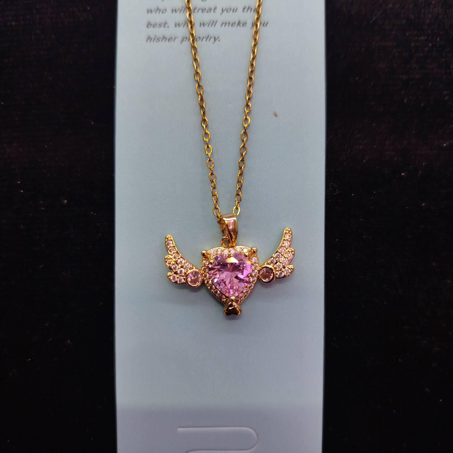 درخشش نگینها: نگین صورتی در مرکز قلب و نگینهای شفاف روی بالها، نور رو به زیبایی بازتاب میدن و توجه همه رو به گردنت جلب میکنن.