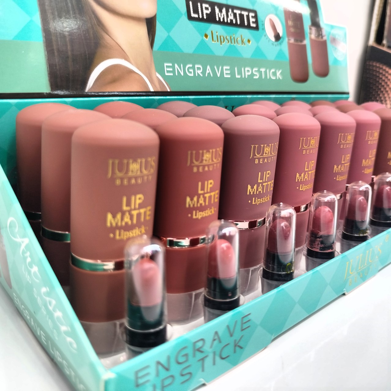 در پسزمینه تصویر، ردیفی از رژ لبها با پوکههای رنگی دیده میشود. برند جولیوس هوشمندانه رنگ بدنه هر رژ را دقیقاً مطابق با رنگ داخلی آن طراحی کرده است تا شما بدون نیاز به باز کردن درب محصول، در کمترین زمان رنگ مورد نظر خود را پیدا کنید.